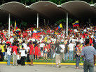 Аллея героев – очень живописное место, даже для богатого видами Каракаса. Две белых стелы со статуями освободителей Южной Америки красиво подчеркнуты зеленым фоном Авилы. Сейчас между ними натянут огромный парус – плакат 16-го Всемирного фестиваля молодежи и студентов. Вся двухкилометровая аллея, от монумента до Площади Чести на военной базе Фуэрте-Тиуна – штаб-квартире сухопутных сил Боливарианской Венесуэлы – занята молодыми людьми, расцвечена тысячами флагов, с преобладанием красных, революционных тонов. Делегаты из ста сорока четырех стран со всего мира. Представители левых, социальных, рабочих, правозащитных, демократических партий и движений. Волонтеры из всех штатов Венесуэлы, от всего спектра чавистских сил, участники всех социальных программ. Тысячи кулаков, взлетающих в ясное небо. Песни и лозунги на десятках наречий. Левый Вавилон наоборот – эта масса людей собралась, чтобы найти общий язык, выработать стратегию организованной борьбы против империализма, войны за другой, лучший мир. Так говорят официальные слоганы фестиваля. Так говорят сердца его участников – по крайней мере, тех из них, кто попал сюда не случайно. К счастью, таких было абсолютное большинство.