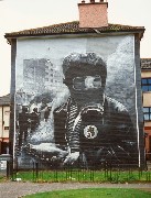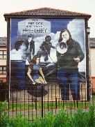 Республиканские граффити явно выигрывают в войне рисунков, а эта война - отражение вооруженной борьбы между Ирландской Республиканской Армией, гражданским населением католических гетто и правыми боевиками-протестантами, поддержанными королевской полицией (Это религиозное разделение лишь по традиции обозначает разделение политических сил; в рядах ИРА воюет немало протестантов). Уличные бои с констеблями и армейскими частями, баррикады, стрельба из снайперских винтовок и гранатометов, взрывы, аресты, побои и пытки. Не такое далекое прошлое, во многом - настоящее Ольстера. На этом сопротивлении выросли целые школы высокохудожественной политической мурали. Особенно известна группа "Художники Бугсайда" из Свободного Дерри, чьи работы посвящены мужественной обороне ирландской общины этого города - с 60-х годов и до наших дней*.