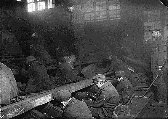 "Завдання, отже, хлопців-робітників вишукувати між вугіллям каміння. В довгих рядах сидять вони один побіч другого над вальцями і перебирають вугілля, що зсовується вниз, і виловлюють з-поміж нього каміння. Це тяжка робота і прикра, особливо в горішніх поверхах "брехи" (конвейера - прим.), де вибирається каміння між грубшими куснями вугілля, там часто аж до крові обточує вугілля пальці. До тих "брех" посилають родичі дітей, звичайно, в 12 років життя, хоч буває, що посилають вже і в 10, а навіть і в 8 років. Денна платня різна - відповідна до віку: 11- і 12-літні дістають 50 і 60 центів, 13-14-літні - 75 і 90 центів. Робочий день триває 9, декуди 8 годин."